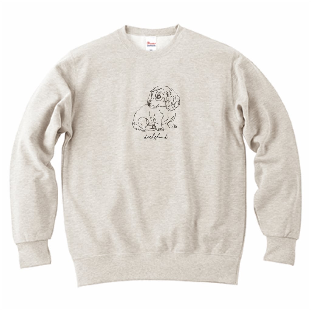 白黒の鉛筆画で描かれたダックスフンドが胸元に佇む、